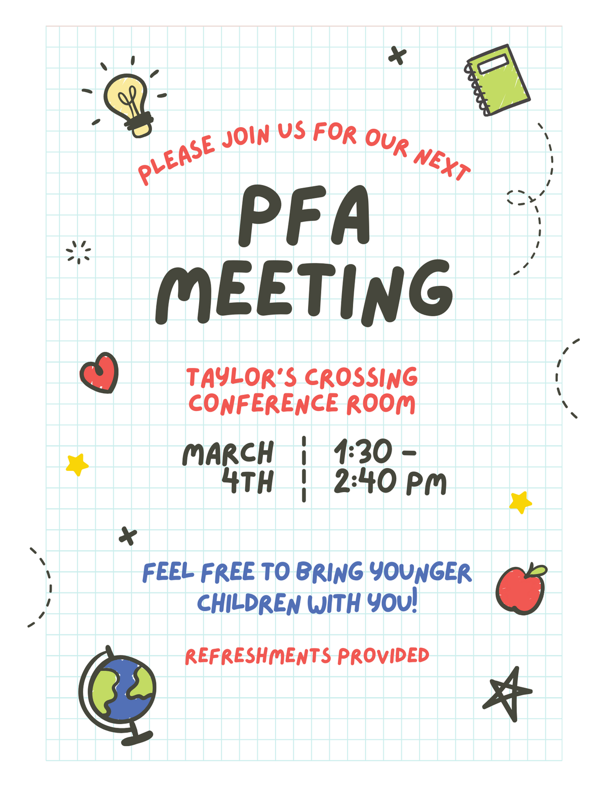 Join us for the PFA meeting, Wednesday, March 4th @ 1:30. Share your ideas and help finalize remaining event plans for 2026 and discuss event ideas for the 2026 - 2027 school year.