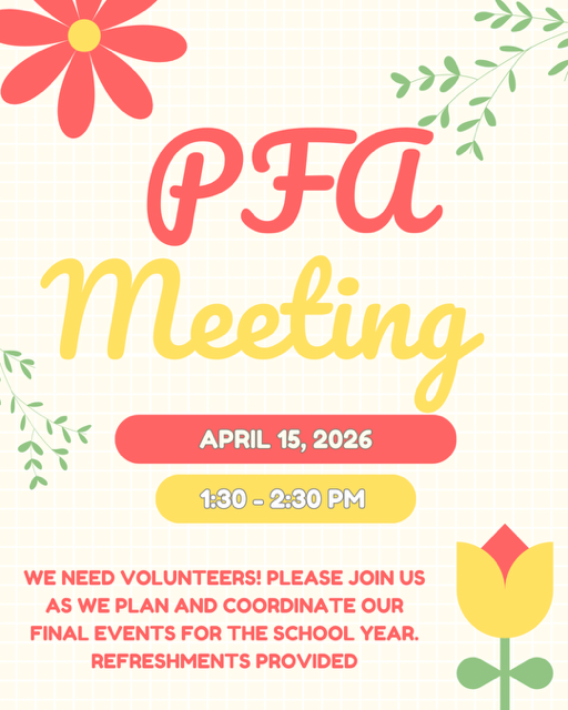 Join the PFA to finalize end of the year events and support teachers during Teacher Appreciation Week! Wednesday, April 15th @ 1:30 in the conference room. We look forward to your input and support...